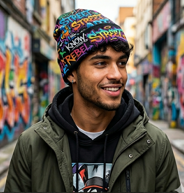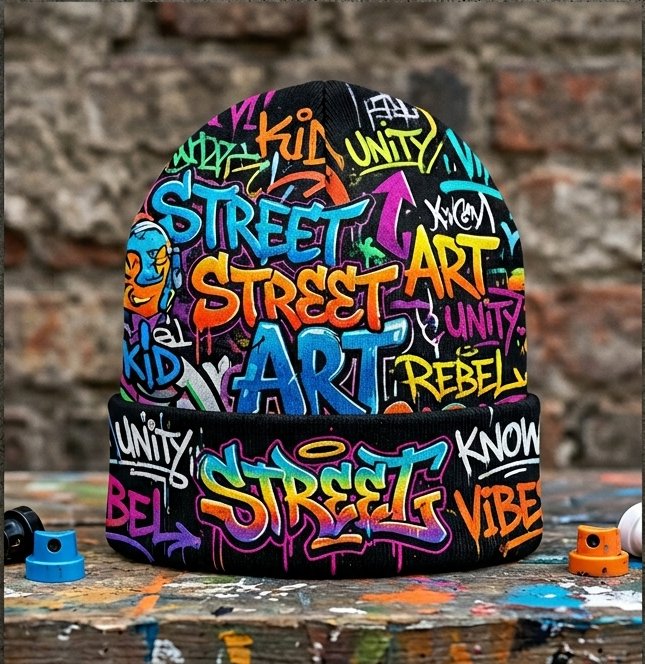 Gorro tejido de fondo negro con un diseño lleno de letras y trazos graffiti en colores intensos como azul, naranja, amarillo, verde y morado. Tiene un estilo llamativo, juvenil y artístico, ideal para destacar en outfits relajados y creativos.