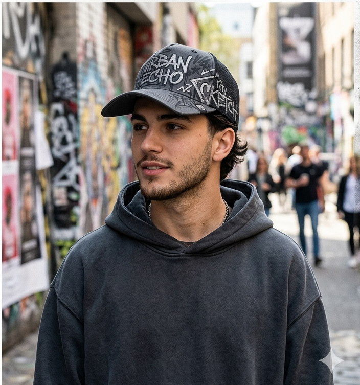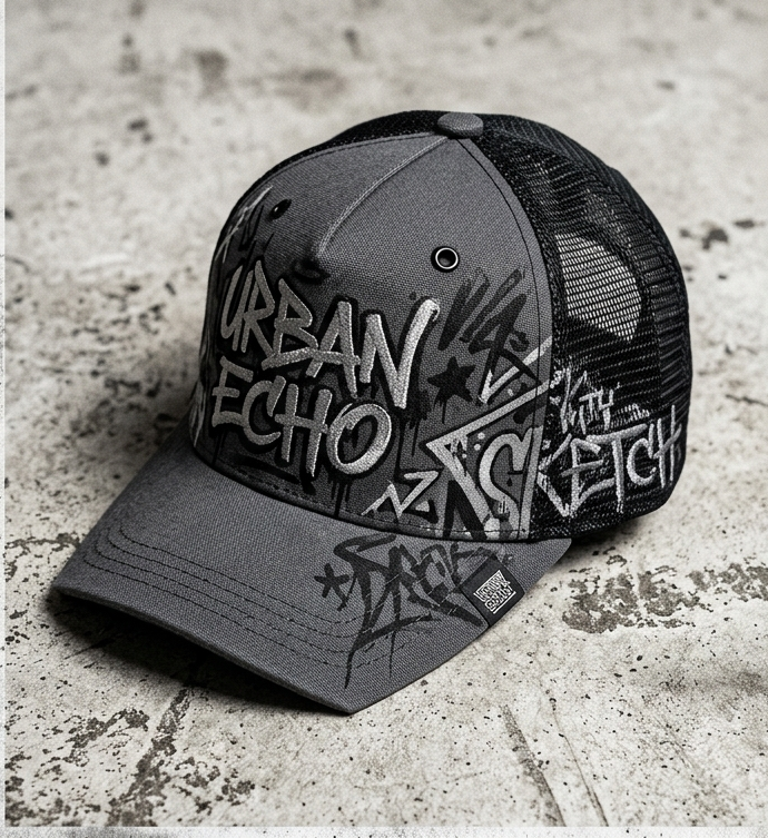 Gorra trucker en tonos gris y negro con paneles de malla y un estampado tipo graffiti que le da una personalidad urbana muy marcada. Es una pieza moderna, versátil y perfecta para un estilo casual con inspiración streetwear.